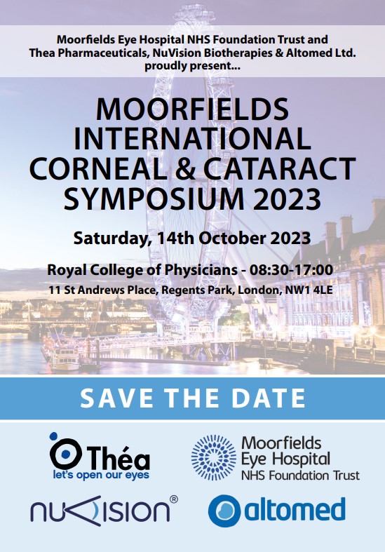 Mr Alexander Ionides & Mr Mark Wilkins, supported by Altomed, Théa Pharmaceuticals and  NuVison  are pleased to invite you to register for your place for the 2023 Moorfields International Corneal & Cataract Symposium!